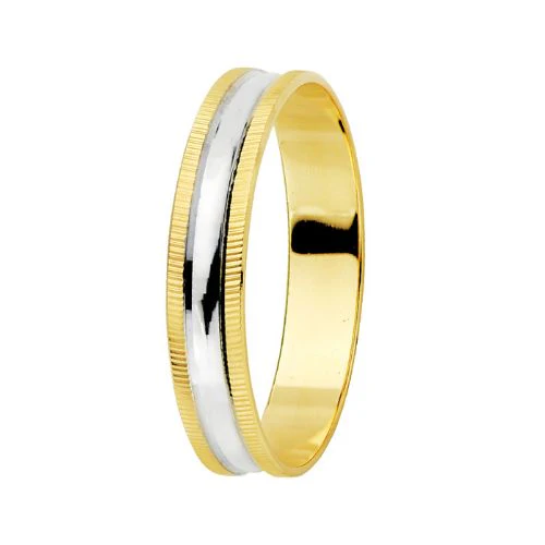Alianza de oro bicolor de 18k, 750 milésimas, de 4 mm de ancho, con el centro de oro blanco liso acabado brillo y los cantos estriados en oro amarillo.