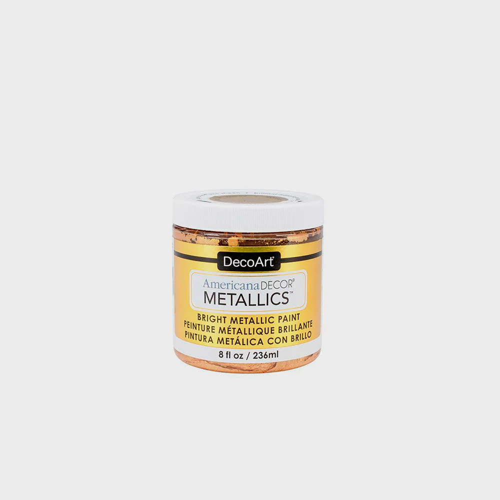 La pintura de la línea Americana Decor Metallics contiene partículas metálicas superfinas que aportan un acabado sutil, cubriente y metálico.