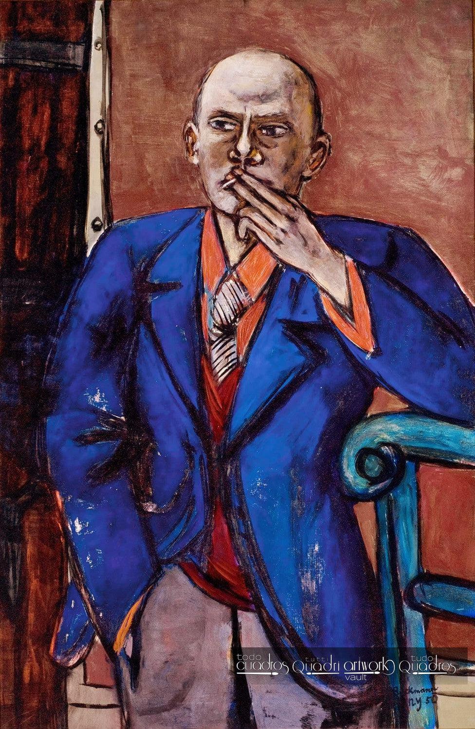 Dice muchísimo sobre la psicología de Beckmann. Se presenta a sí mismo sin adornos, pero lleno de obstáculos para llegar a él mismo. La chaqueta de un azul vivo vibra con el color naranja de la camisa, colores alegres que contrastan con el ceño fruncido del personaje.