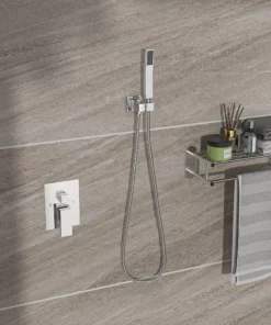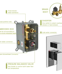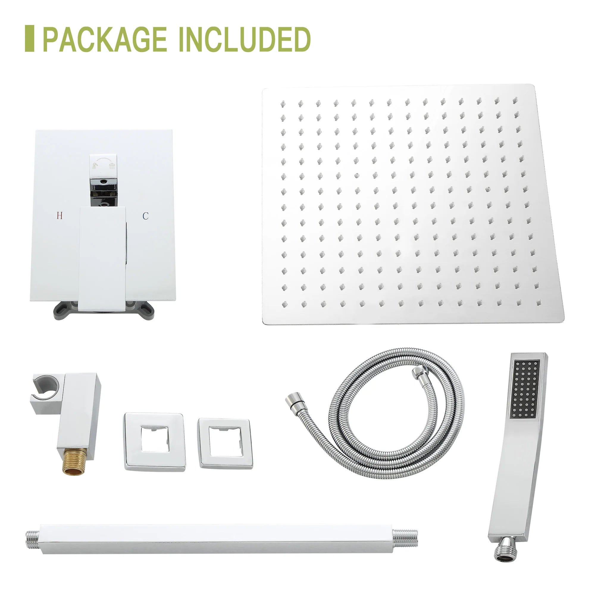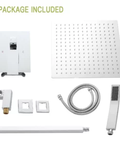 - {Componentes incluidos} Cabezal de ducha de lluvia cuadrado de 16 pulgadas, brazo de ducha, cabezal de ducha de mano, manguera de ducha de 59″, soporte de ducha, válvula de control de agua, piezas e instrucciones de instalación.
