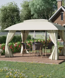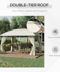 - Techo de arco con ventilación doble: el dosel de nuestro cenador está diseñado con una ventilación que permite un flujo de aire cómodo por debajo para mantenerte fresco. Ambos niveles del dosel de nuestro cenador de patio están hechos de poliéster recubierto de PA para evitar quemaduras solares sin decoloración en días soleados. La ventilación está protegida con malla, lo que garantiza que no entren cosas que piquen por la parte superior.