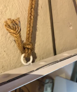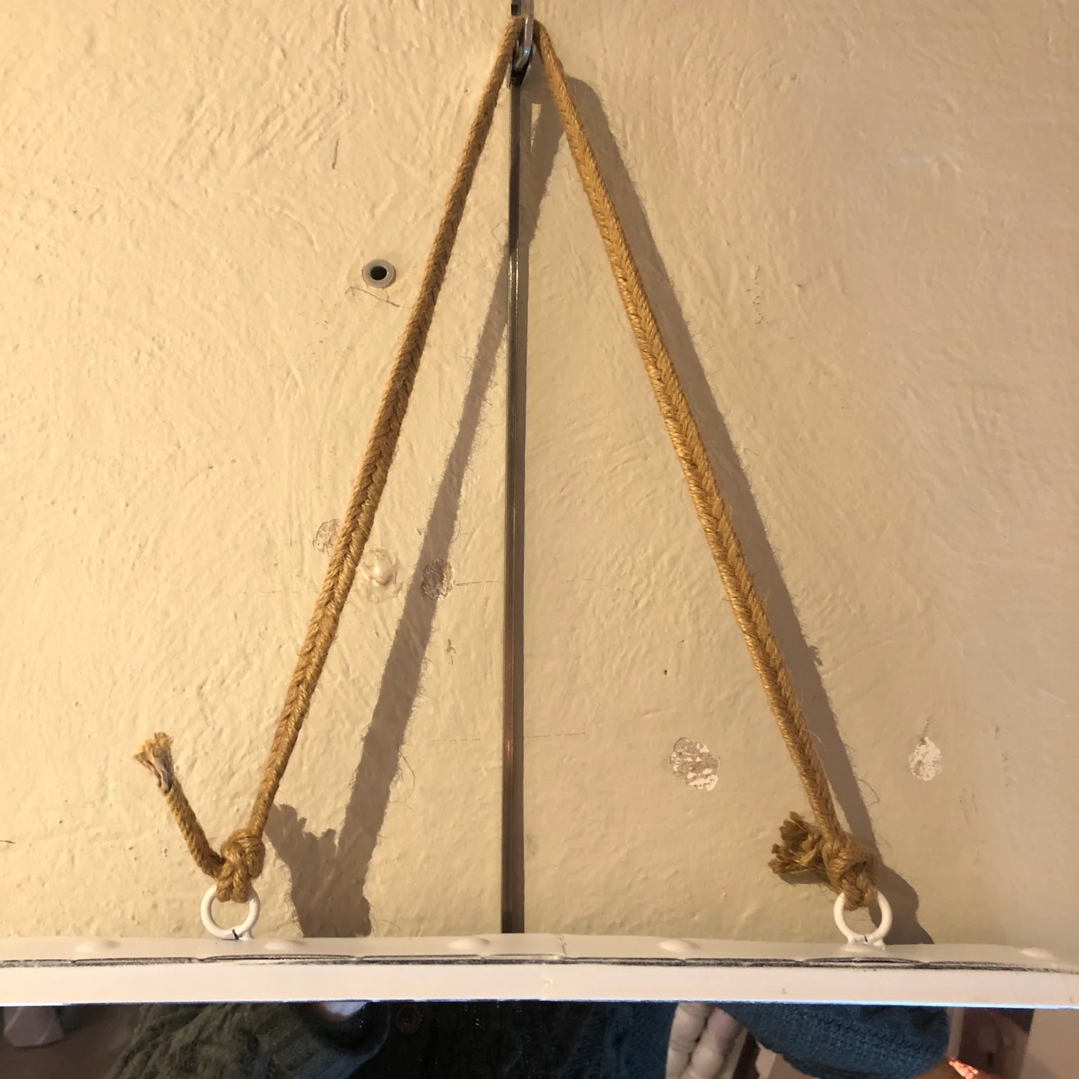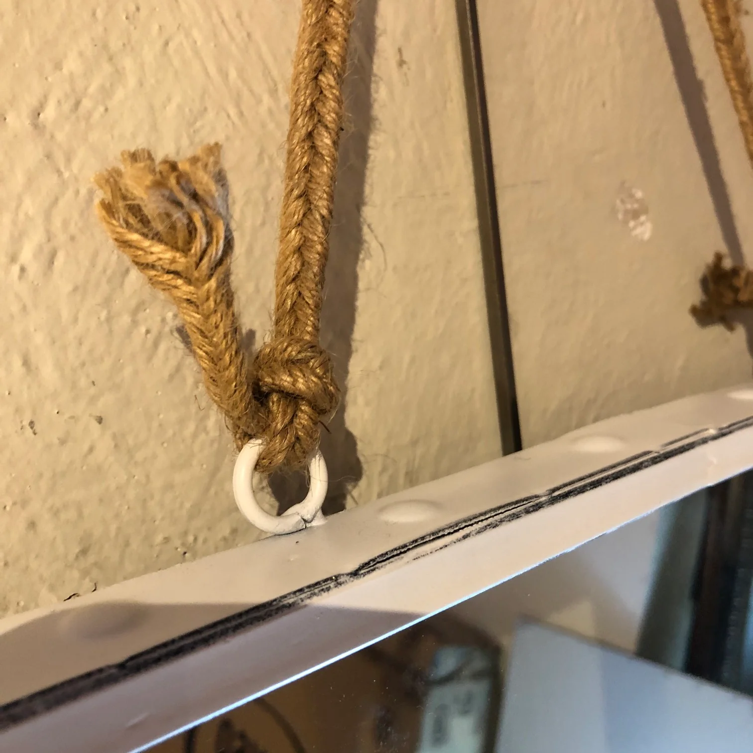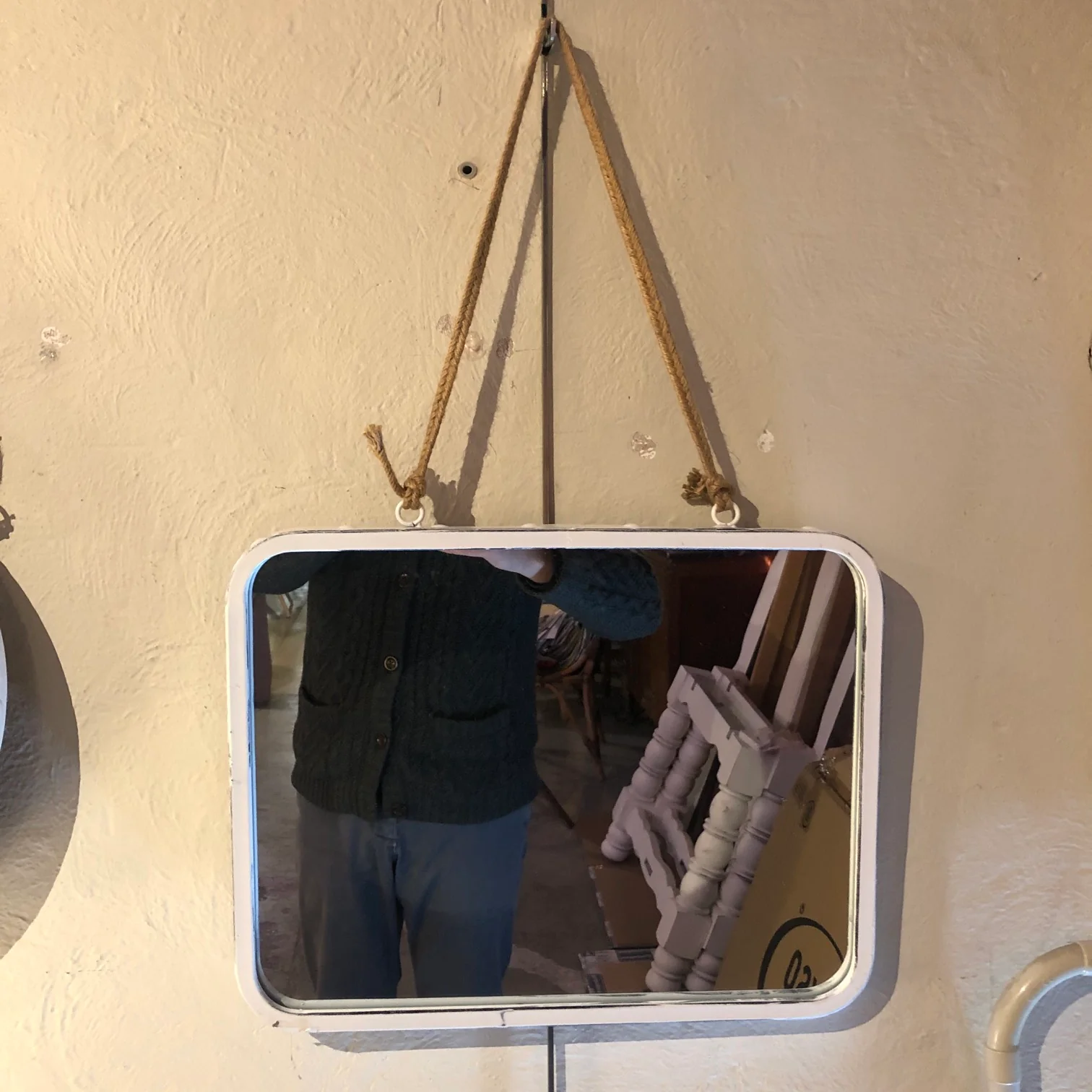 DESCRIPCION: espejo metálico en color blanco con tachuelas y cuerda para su sujeción