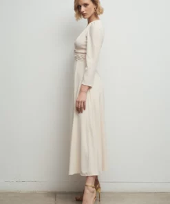 Vestido midi de invitada de fiesta. Manga francesa. Escote a pico con diseño de nudo fruncido.